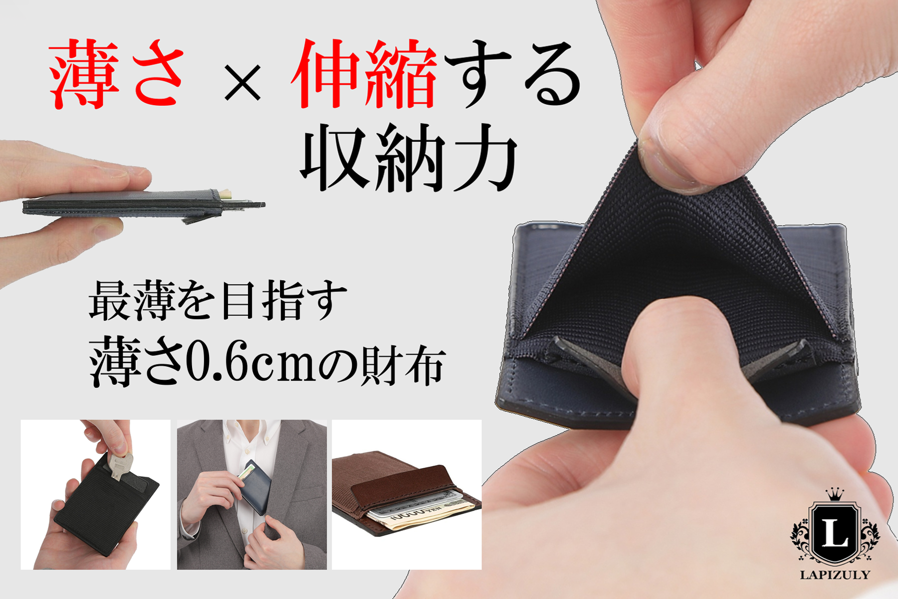 今回の財布は、長財布や折りたたみ財布では実現ができない、小ささと薄さを両立。必要最低限を持ち歩く方にとって、財布の中身が少ないほど財布の厚さが6mmに近づく設計です。